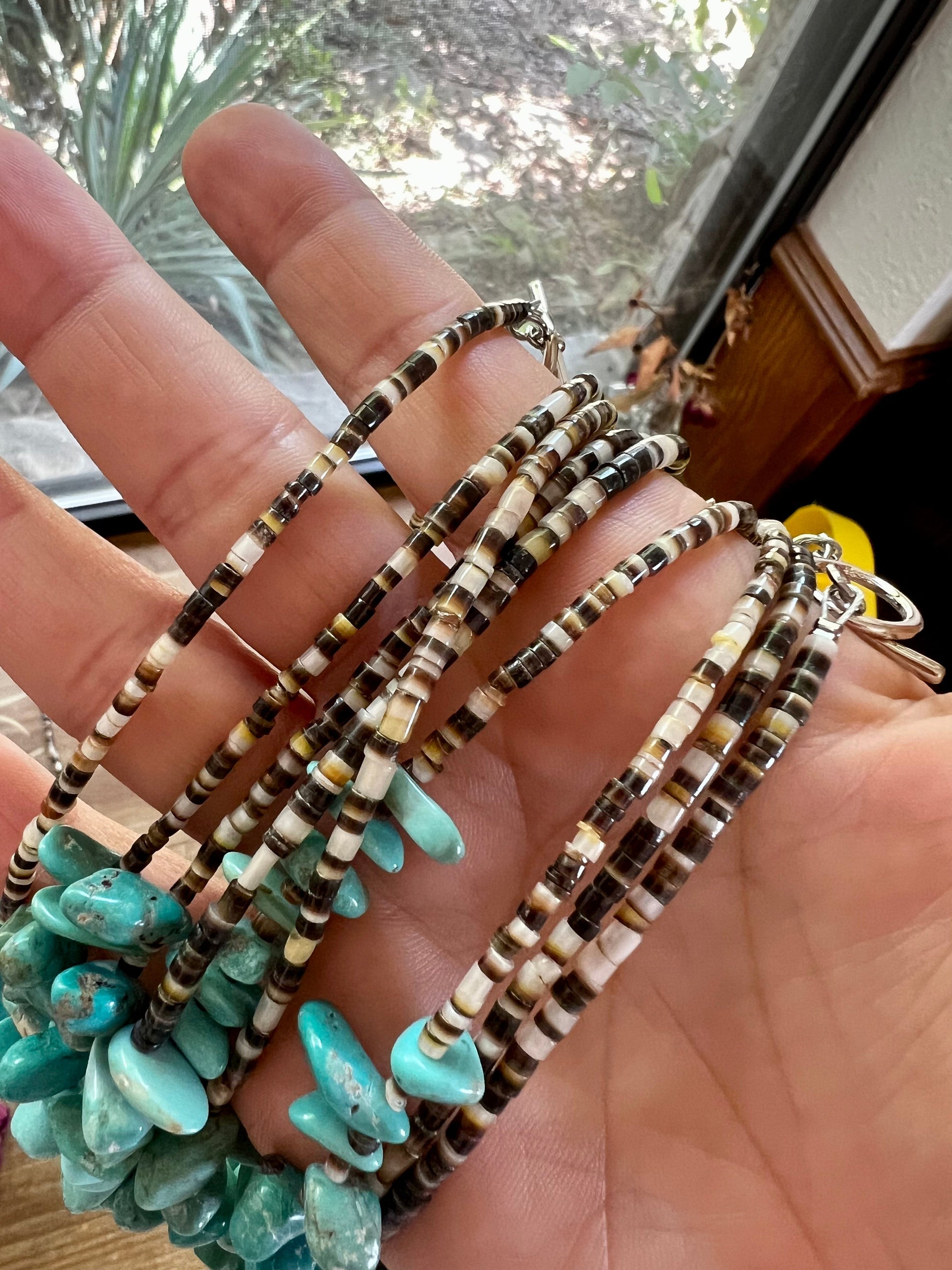 22 inch long real turquoise and shell teardrop shape blue side
